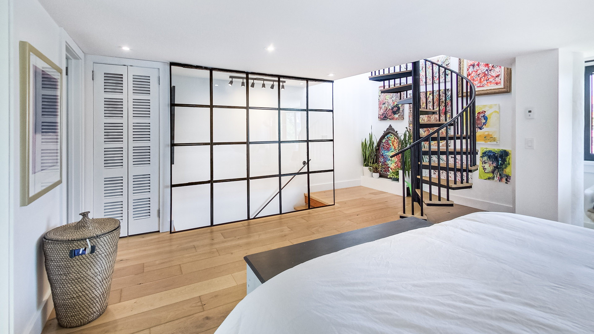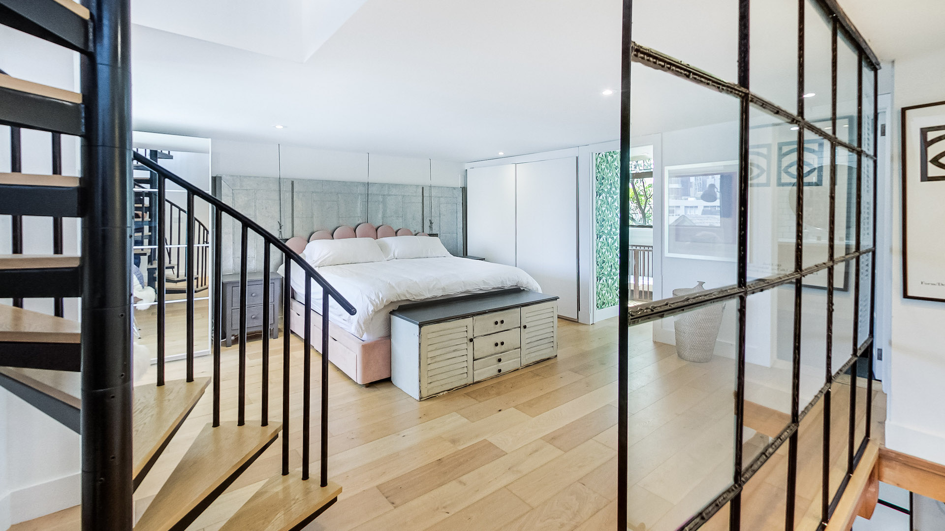 Ascending past the Shoji-inspired glass partition, come upon the bright and airy primary bedroom. The spiral staircase that winds its way to the rooftop creates a unique focal point.