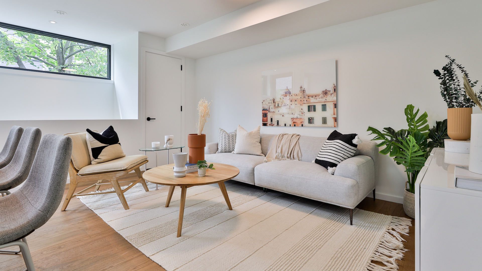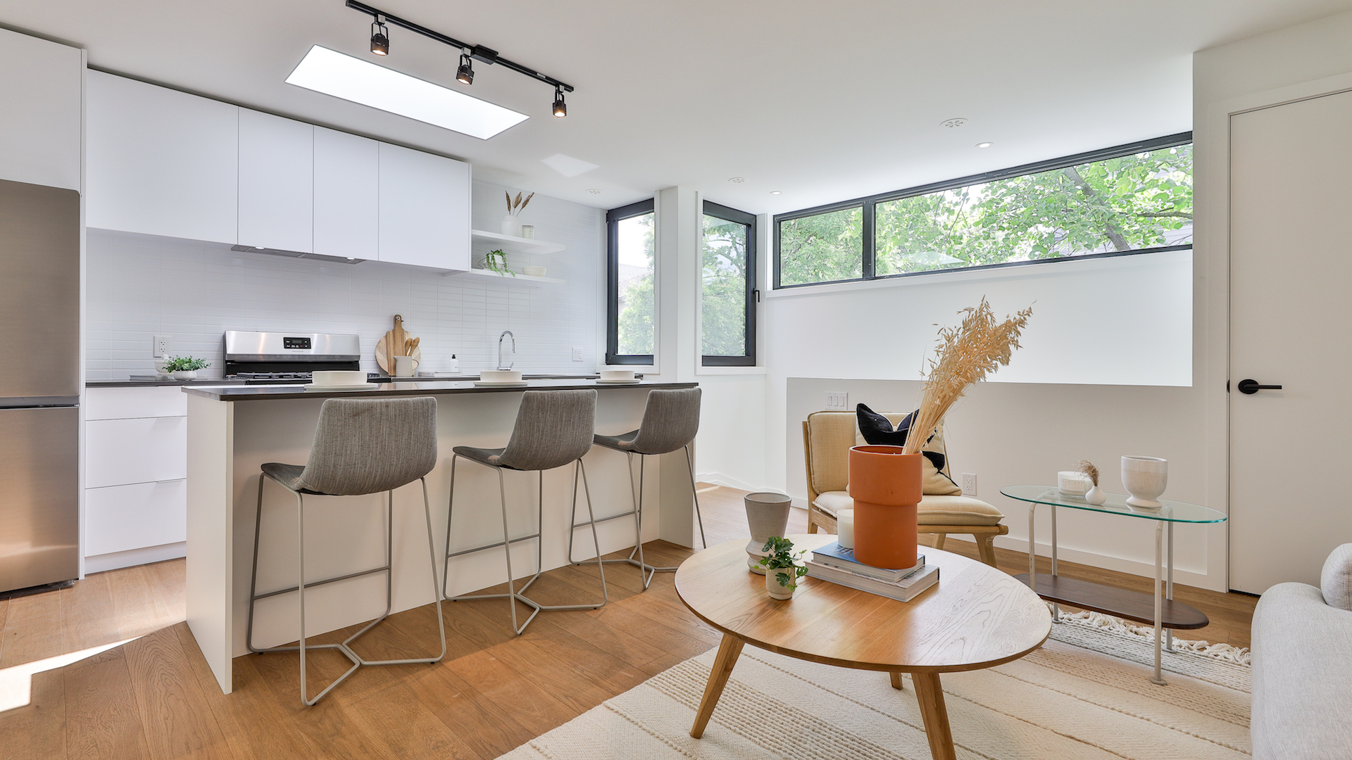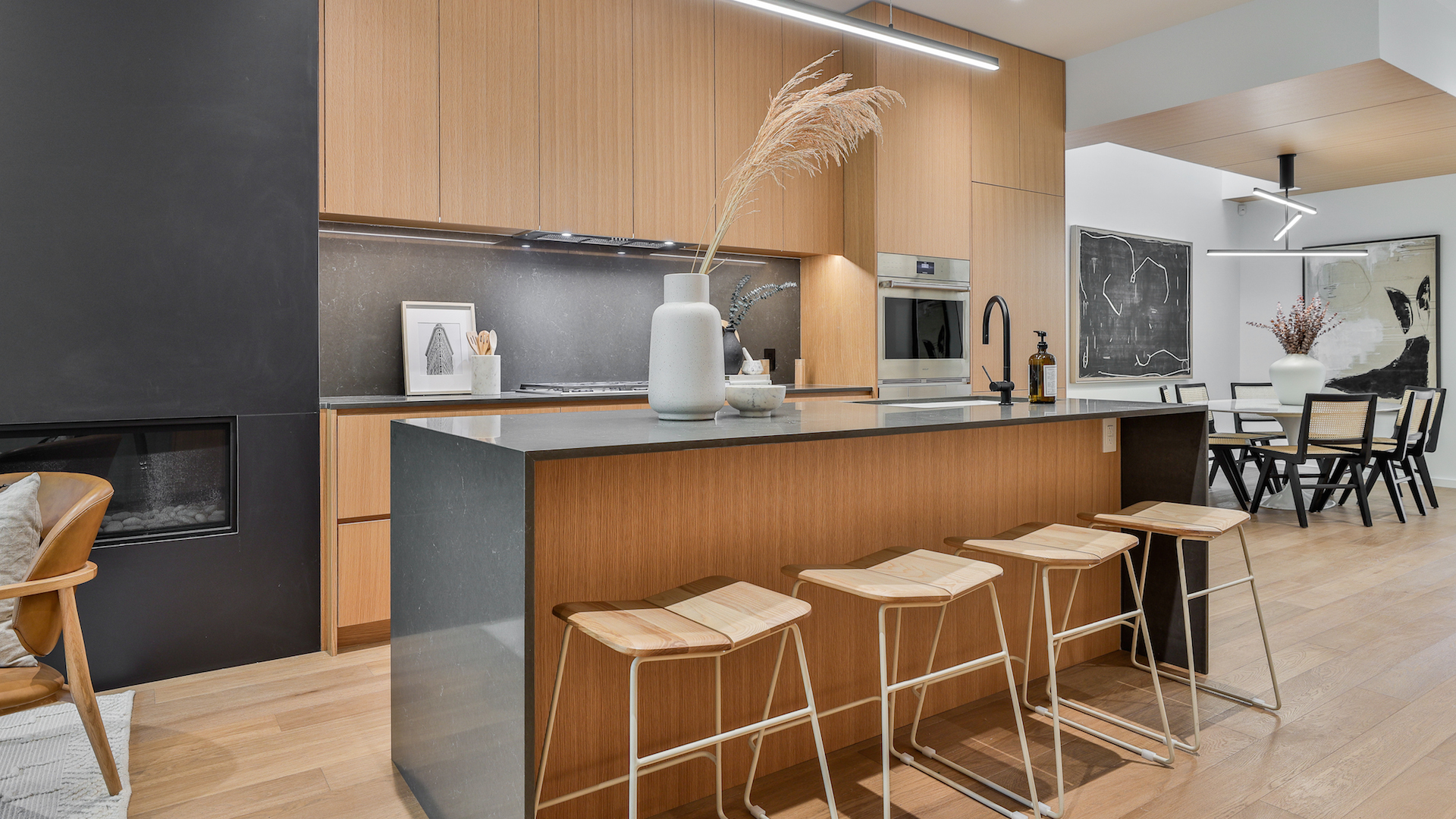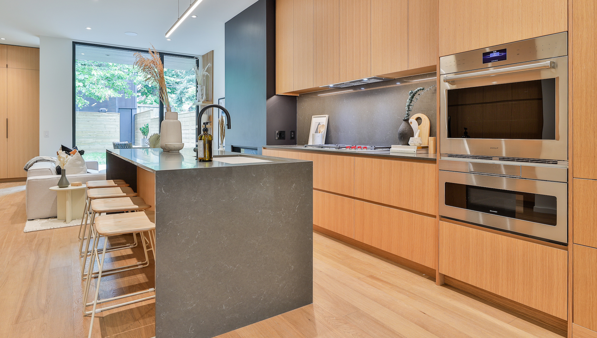 With white oak cabinetry and a quartz-topped island, the kitchen offers an elegant blend of simplicity and style.