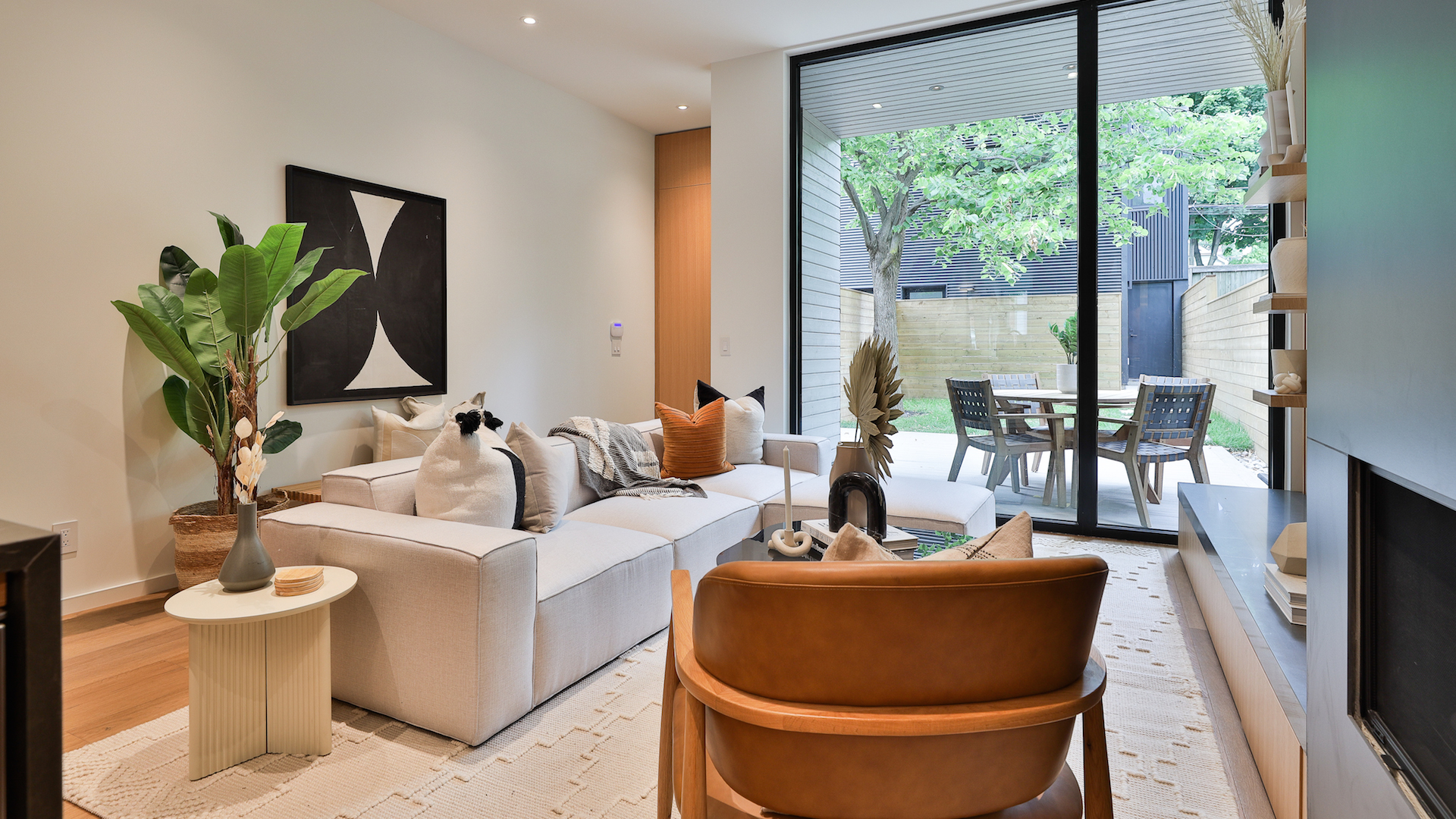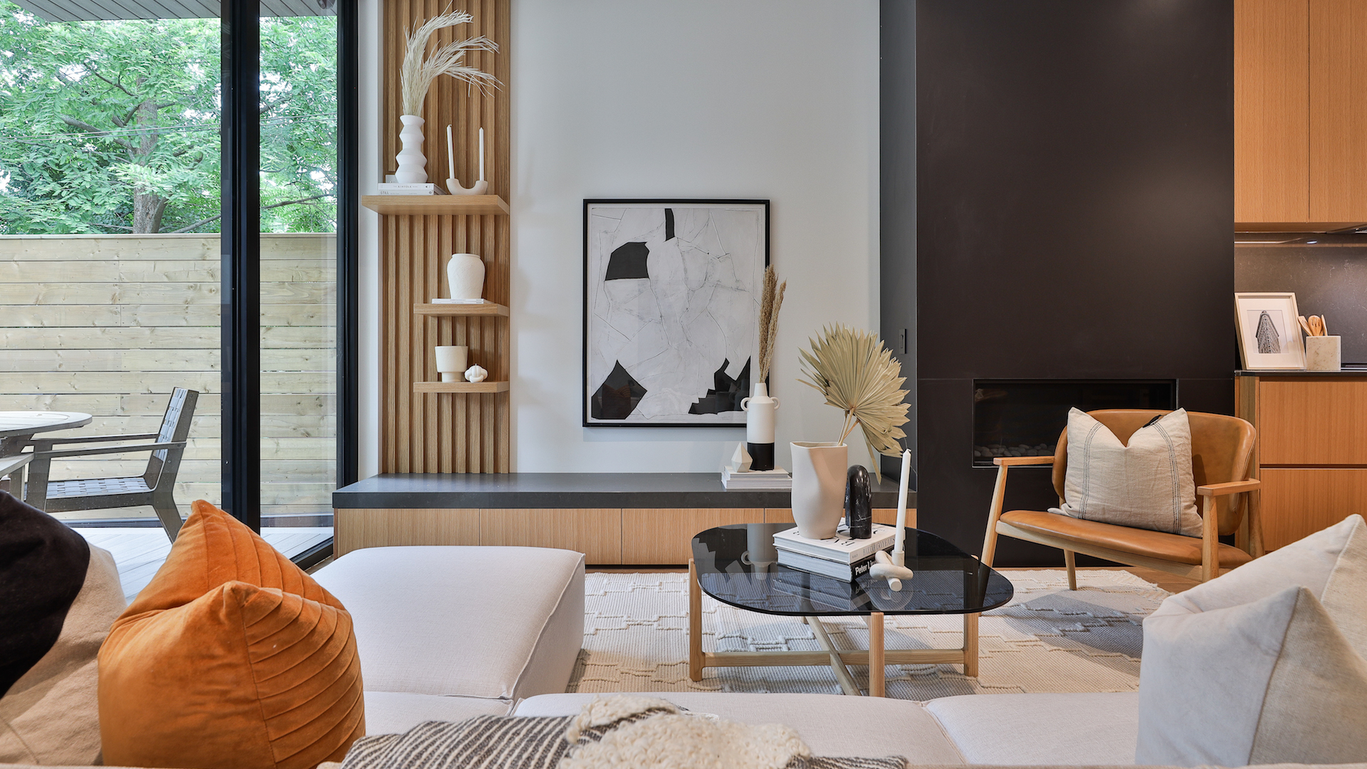 The living room, situated at the back of the house, looks onto the backyard and offers a wall of floor-to-ceiling windows and an ultramodern porcelain fireplace with bespoke built-in accents. It’s the epitome of sophisticated spaces.