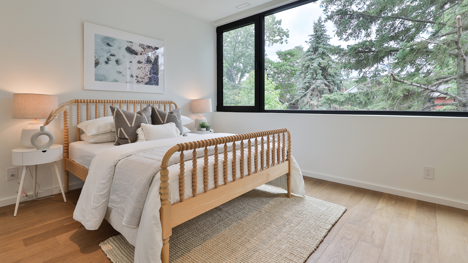 Here’s one of four spacious bedrooms. The expansive window offers gorgeous evergreen views and allows plenty of natural light to stream through.