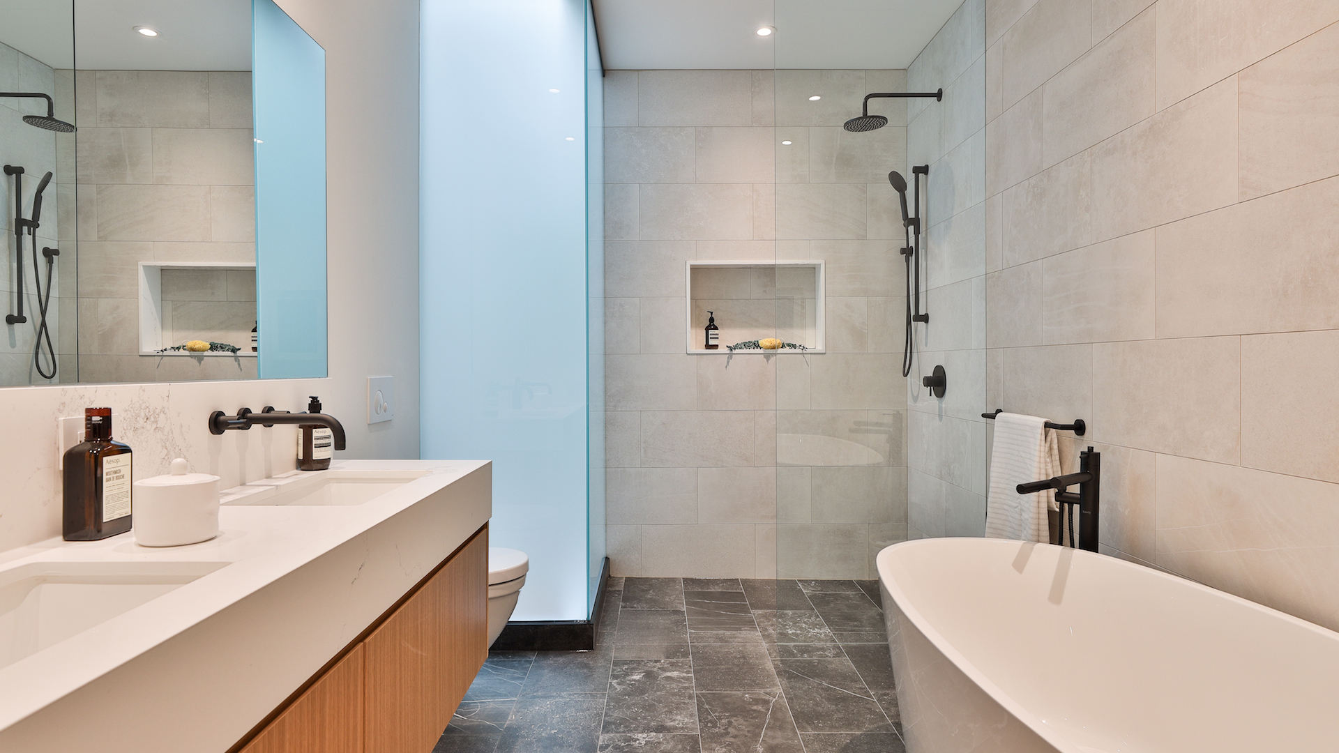 The luxe ensuite bathroom has a rainfall walk-in shower, sleek double vanity and a free-standing tub ideal for soaking in bubbles.