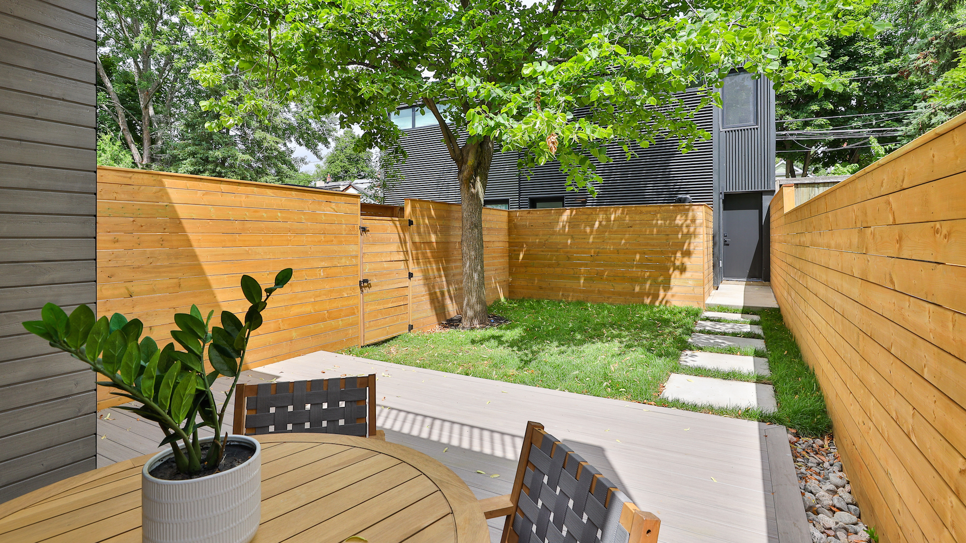 The private, fenced backyard features the perfect balance of green space and social space.