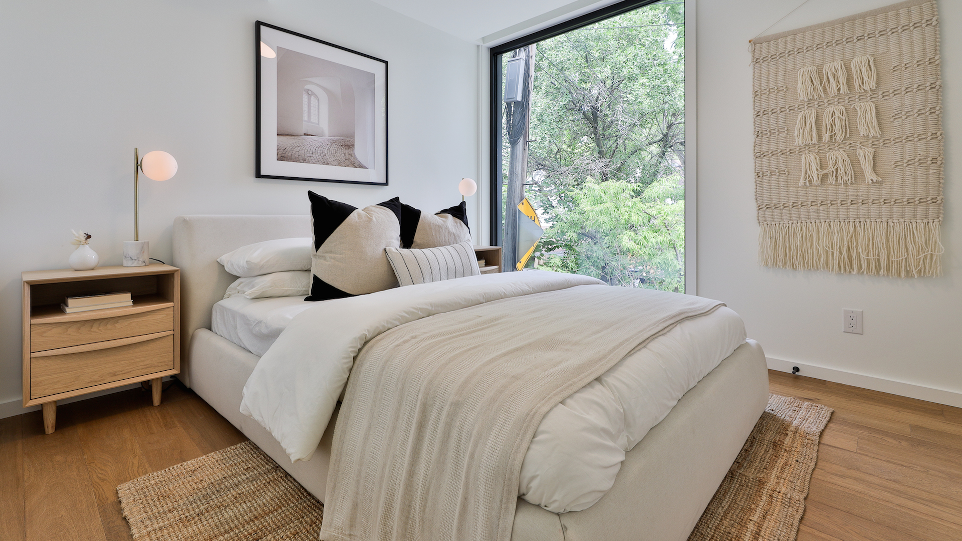 The bedroom, which faces a quiet laneway, is a calming space for rest and reflection. Like the rest of the suite, it features stylish wide-plank floors and plenty of natural light.