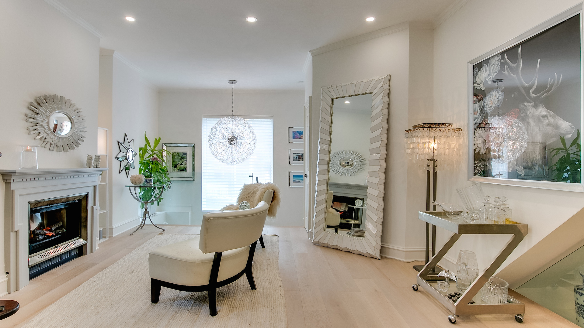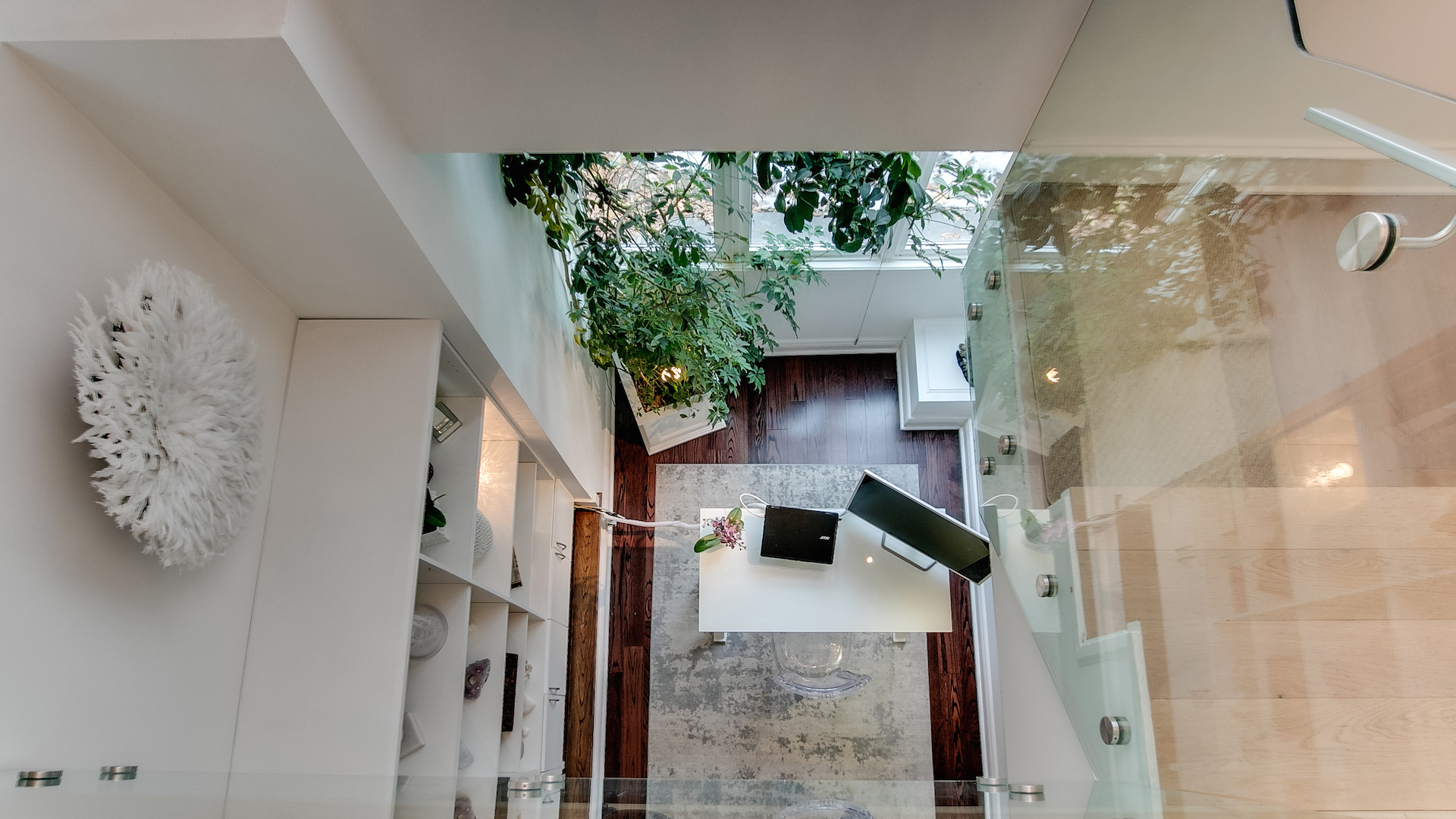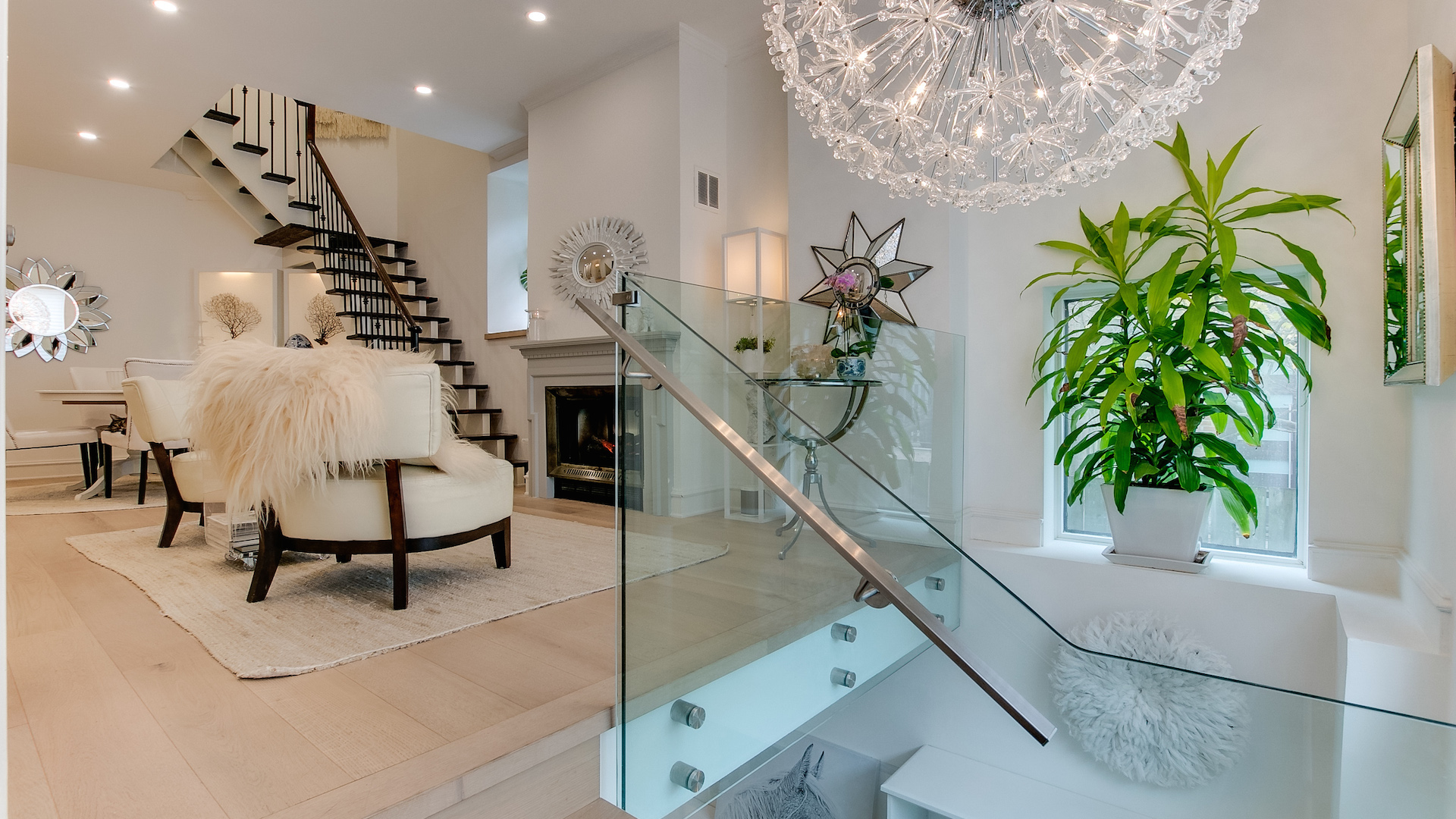 A floral stained glass window graces the front entrance in a nod to the home’s 19th century roots, while the living room offers a contemporary space with lots of sunlight. The open-concept layout, sun-bleached hardwood flooring and glass-panelled front mezzanine create a light and airy ambiance.