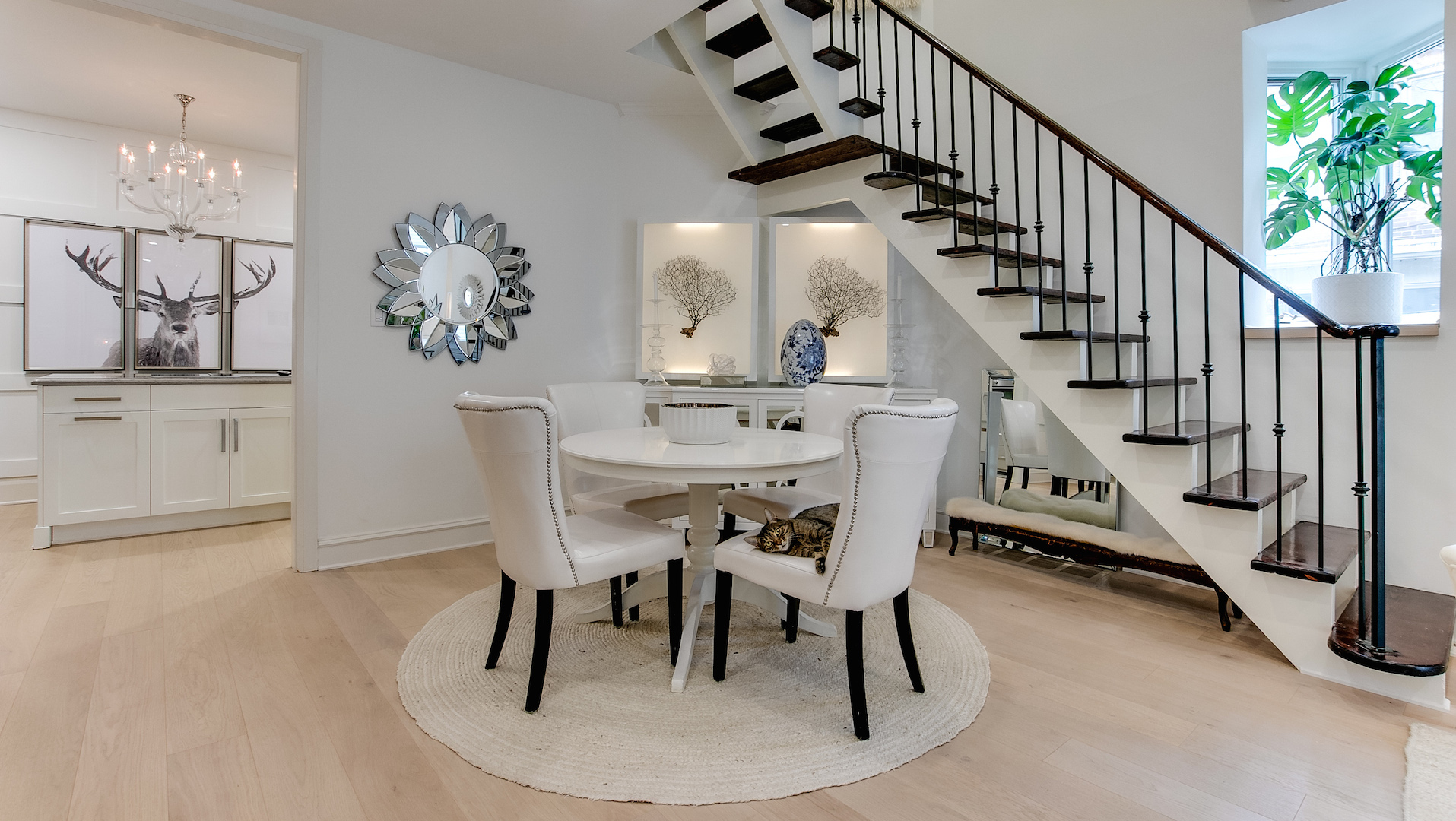 Snuggled alongside the open-riser staircase is a charming dining area. See the tabby cat peeking out? He’s enjoying all that warm sunlight streaming through the stairwell window.