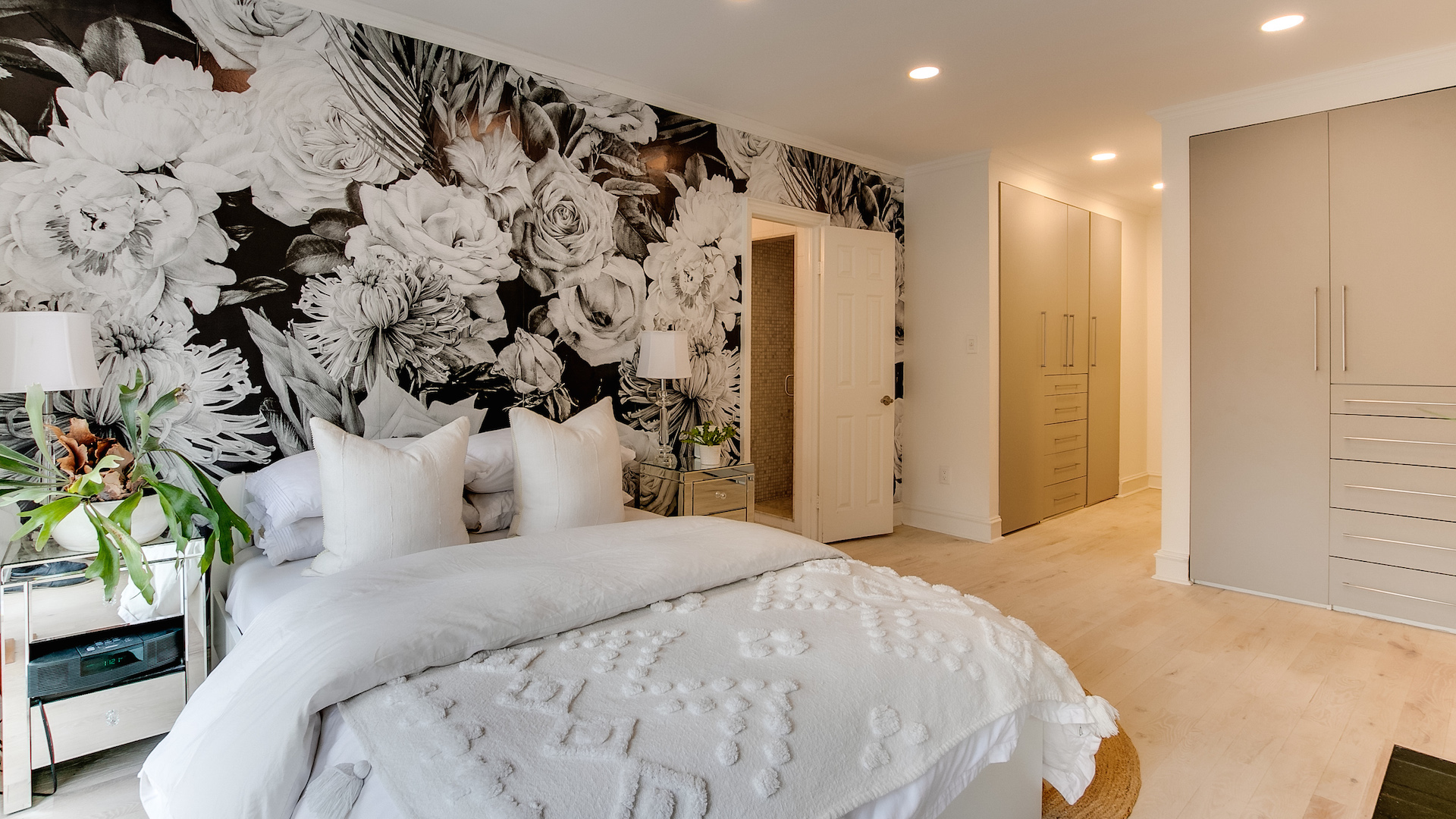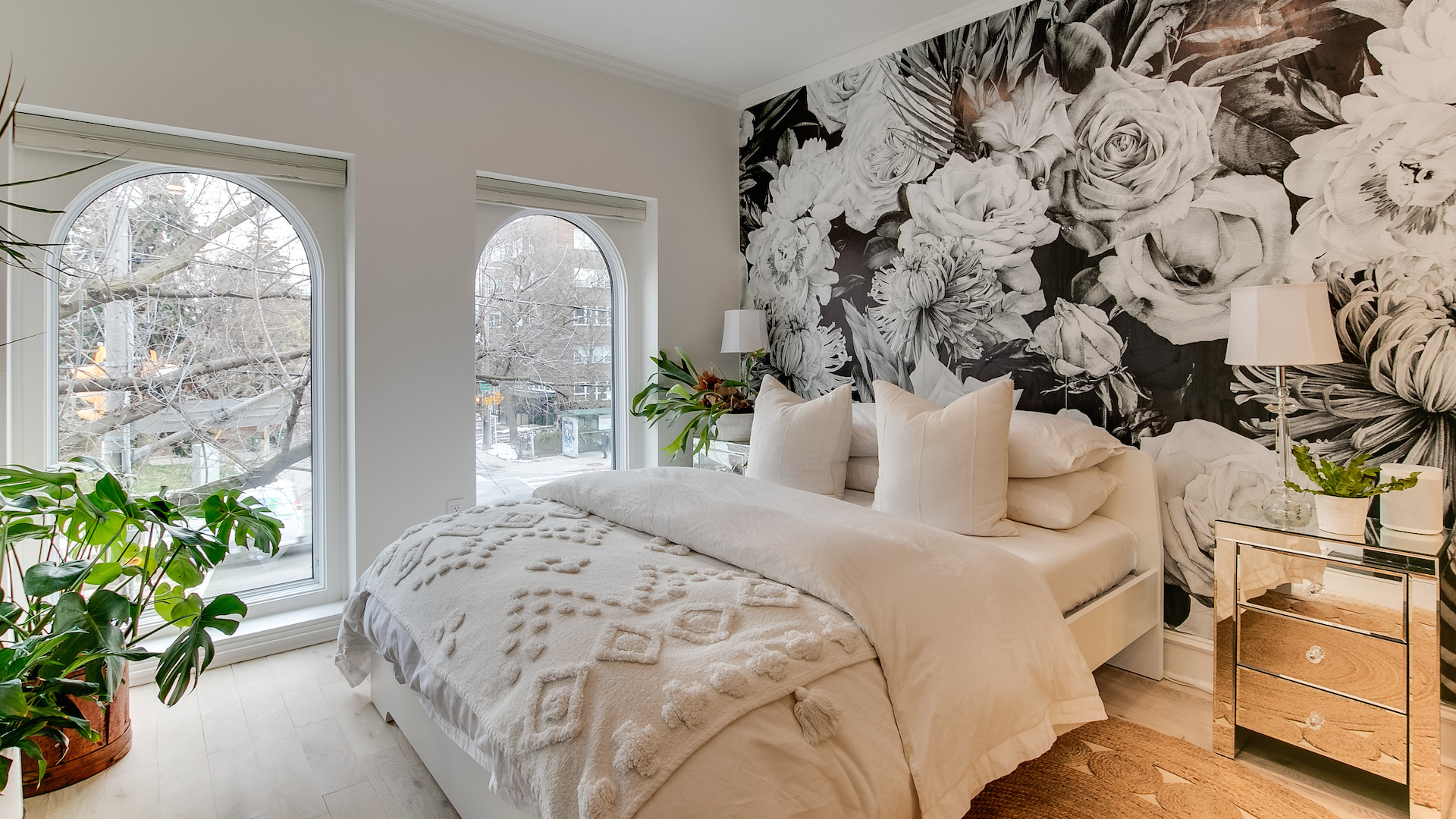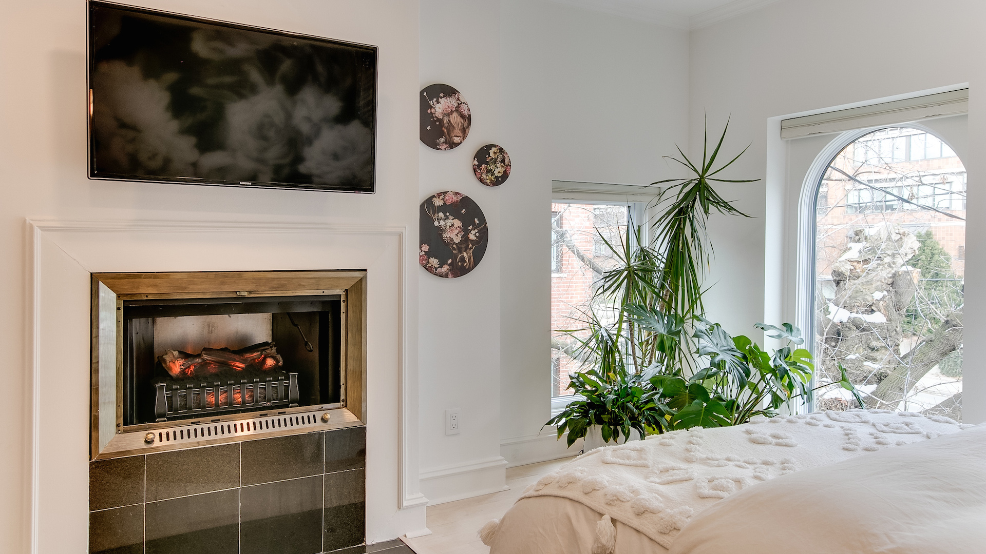 Upstairs you’ll find one of the dreamiest primary bedrooms you’ll ever see. Multiple arched windows make for the perfect spot to grow healthy houseplants, while the fireplace adds a touch of coziness.