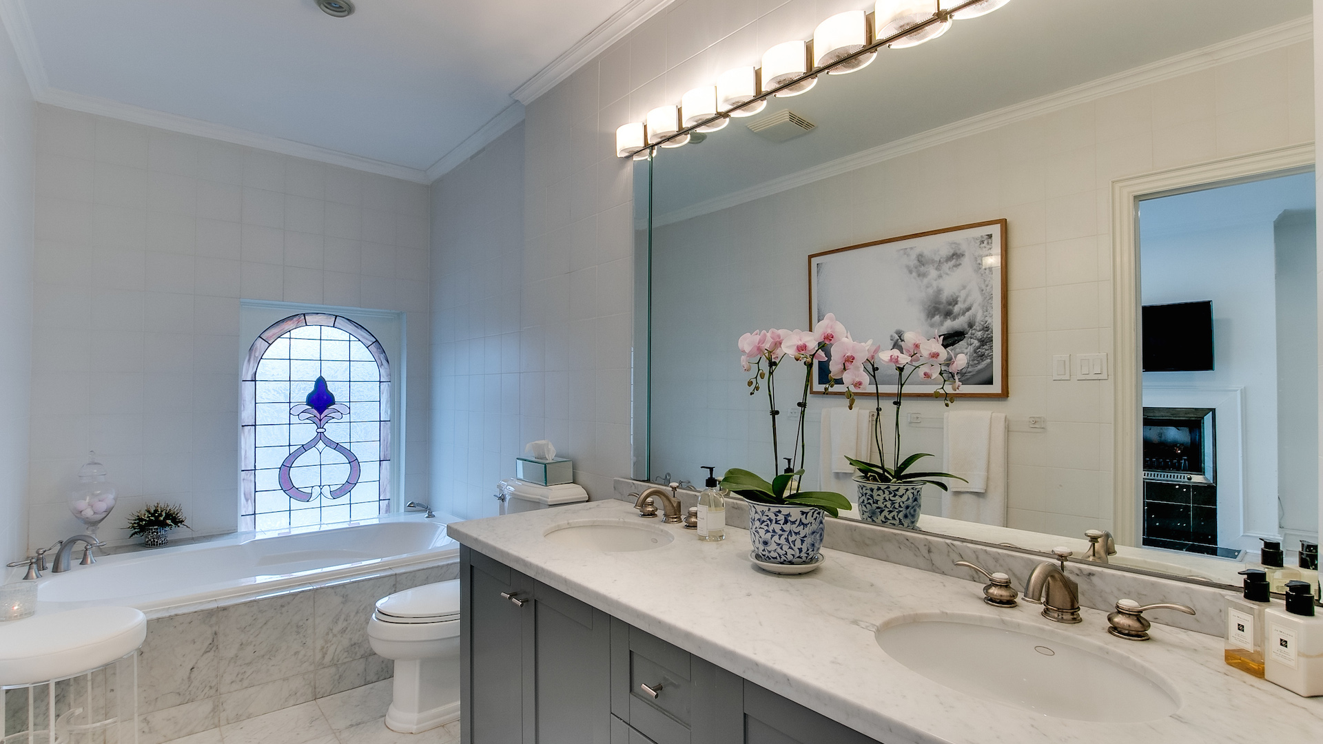 Along with plenty of built-in storage, the primary bedroom also features a five-piece ensuite bathroom. The soaker tub nestled beside the stained glass window makes a pretty spot for relaxing bubble baths.