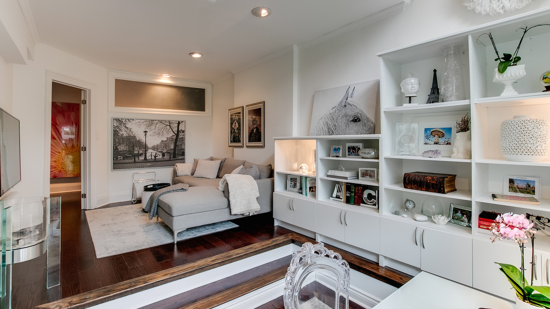 Despite being downstairs, the family room is incredibly cheerful and bright — all thanks to the mezzanine lightwell and a street-facing solarium window.
