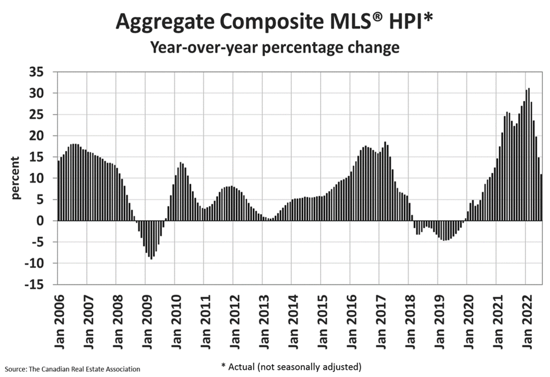 As for home prices, they were down just 1.7 per cent month-over-month, but the non-seasonally adjusted Aggregate Composite MLS® HPI was still up by 10.9 per cent on a year-over-year basis in July.