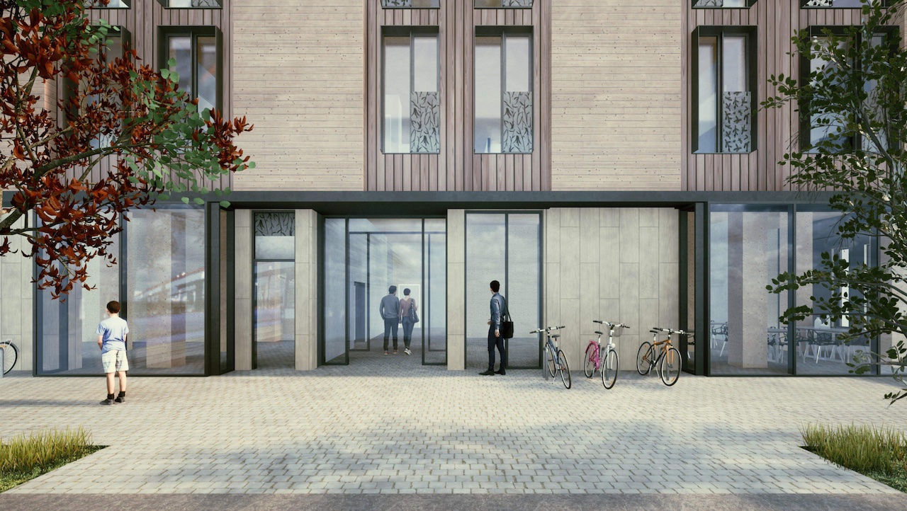 Rendering of Dundas West mass timber building affordable housing plans