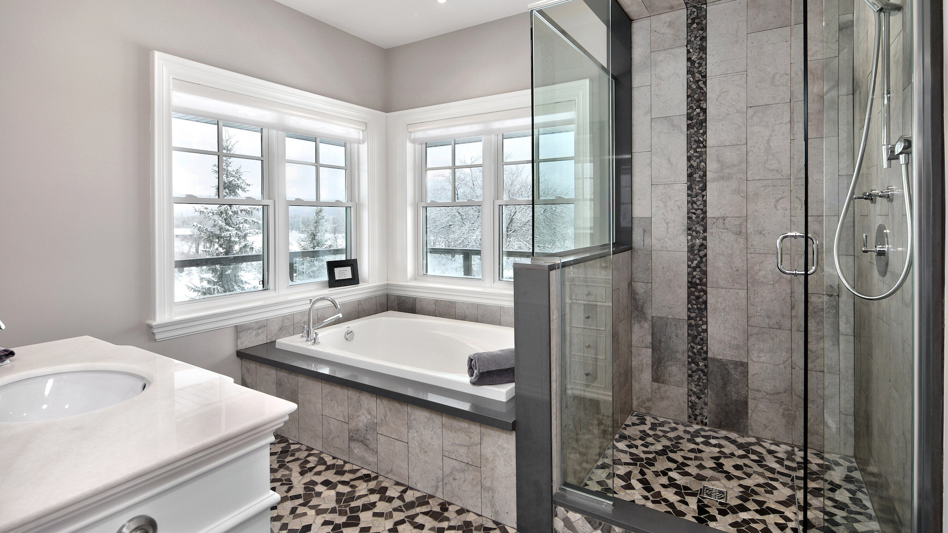 There’s a primary suite on the main floor and two bedrooms on the upper floor, plus beautifully designed bathrooms.