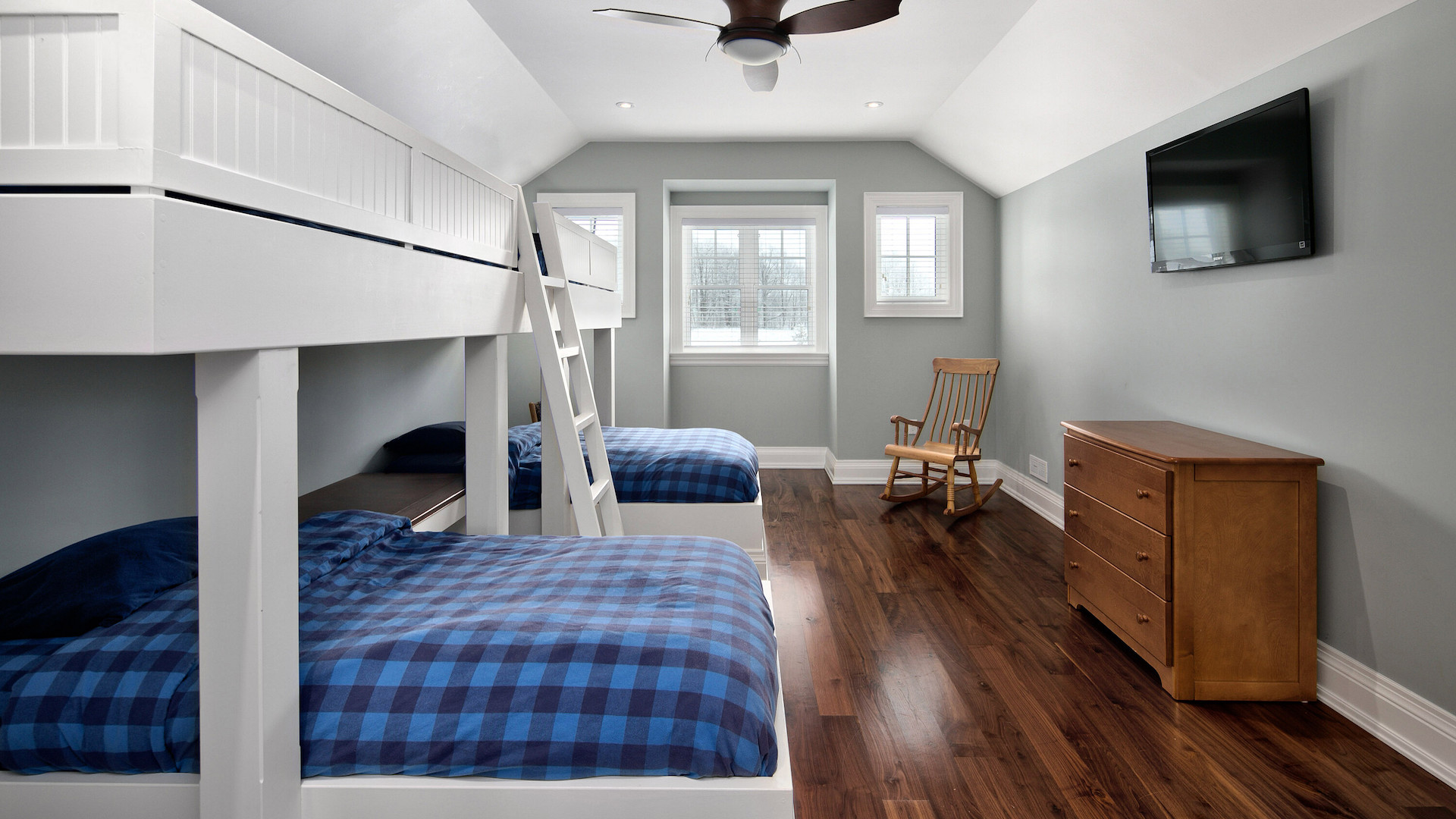 The gourmet kitchen is ready for entertaining guests after they battle it out on the rink, and the open concept living room comes with a fireplace and plenty of space to host a whole hockey team.