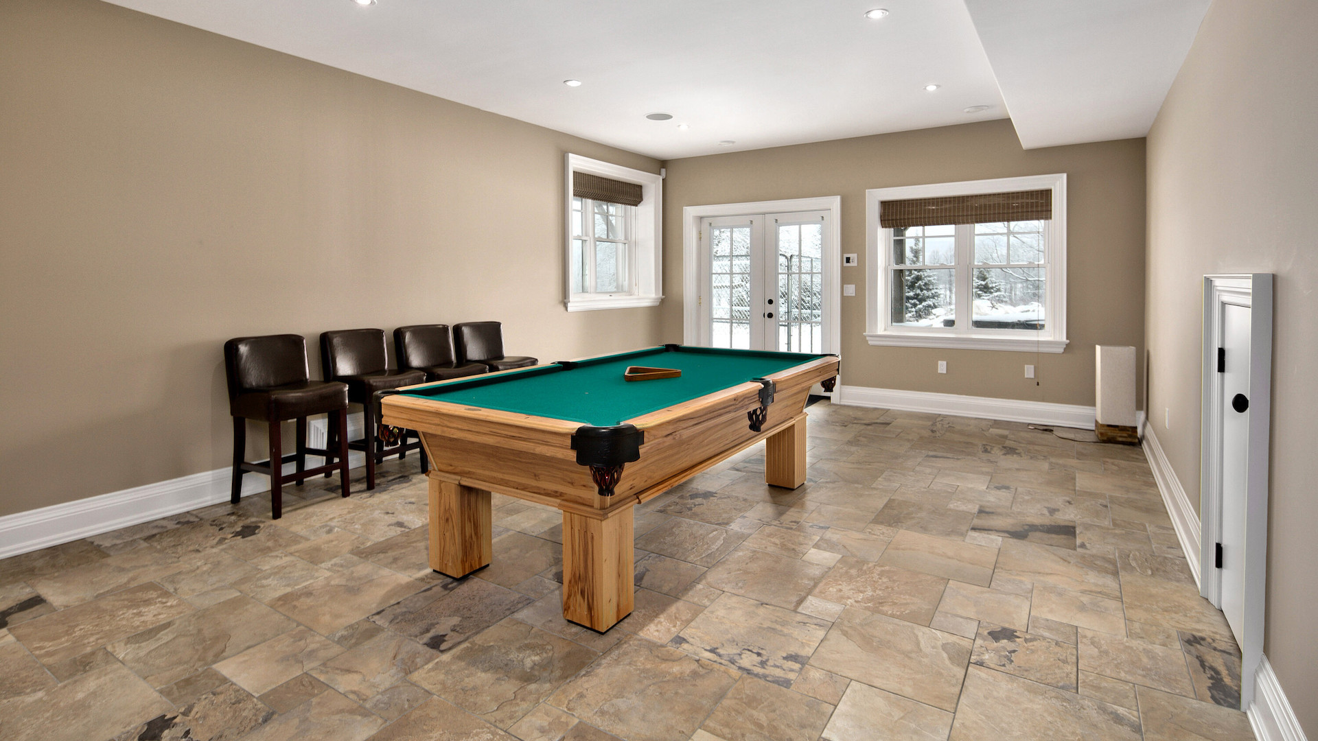 There’s a pool room, media room, guest room and bathroom on the lower level, with a walk out the hot tub in the backyard.