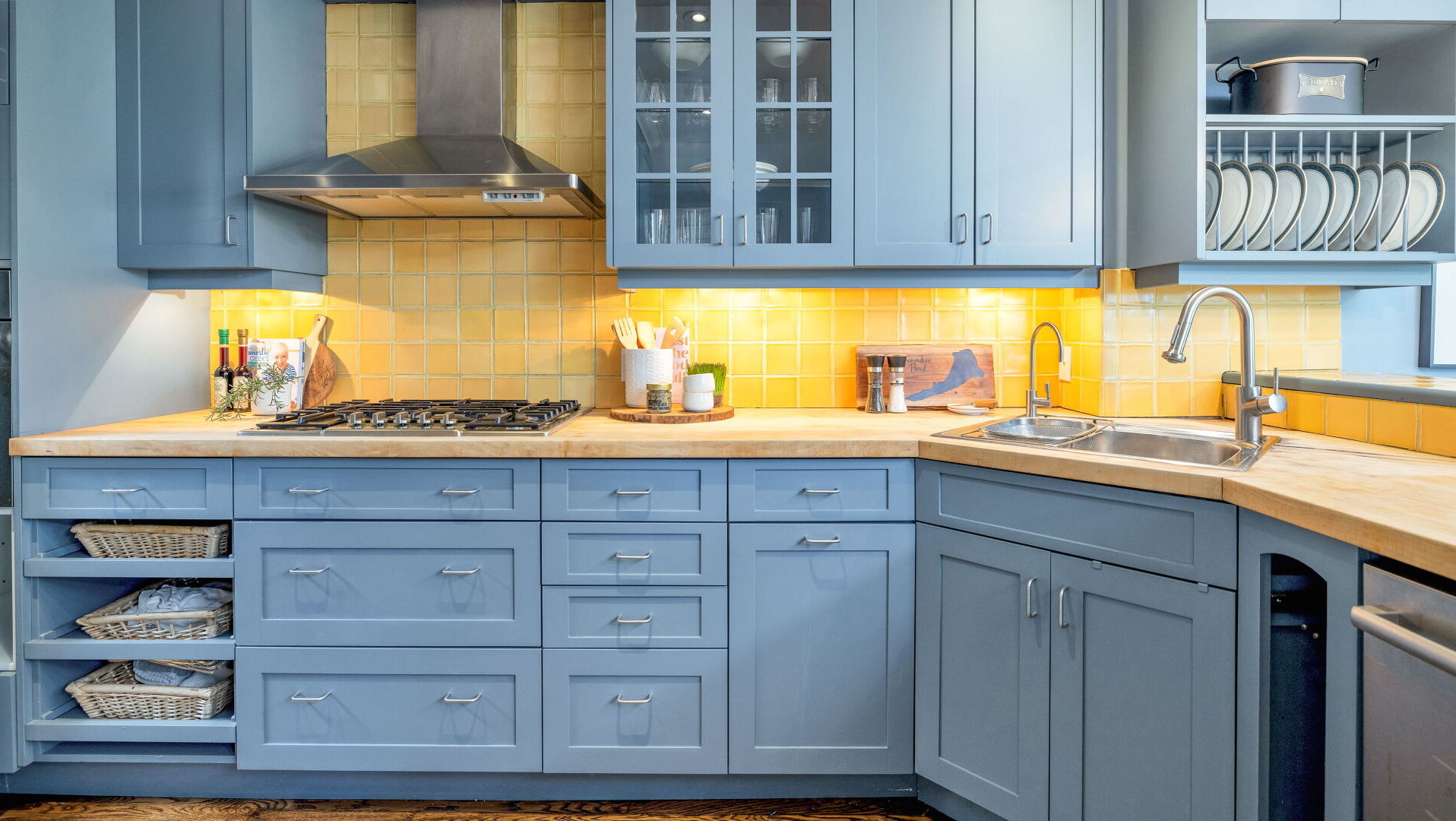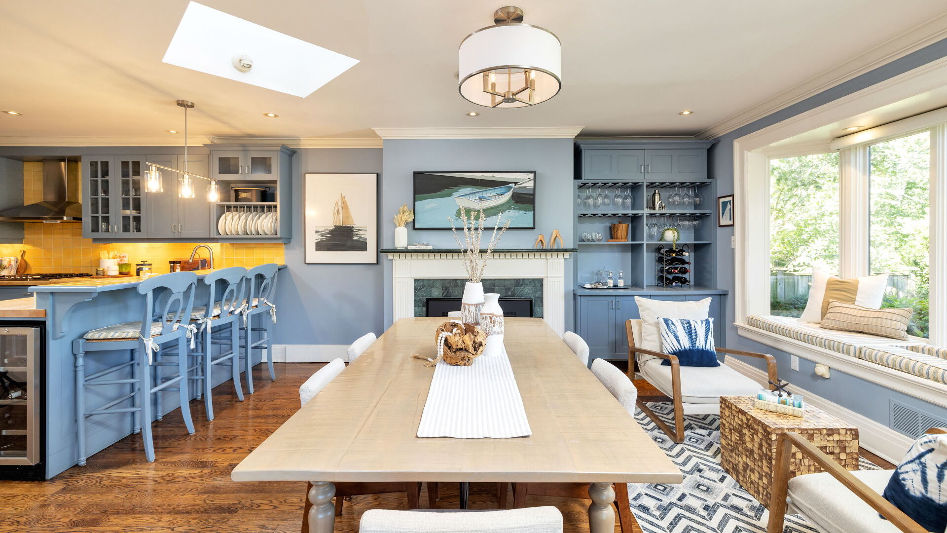 The combined kitchen, dining room and family room is an equally lovely space. Upgraded with delightful cornflower blue shaker cabinets and top-of-the-line appliances, you’ll also notice a cozy fireplace and box window seating.