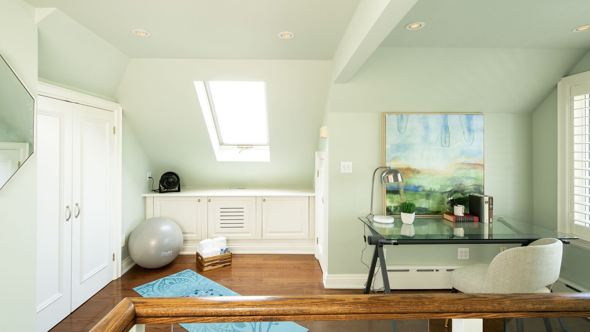 The third floor loft is a delightful retreat where sunlight streams through several skylights.