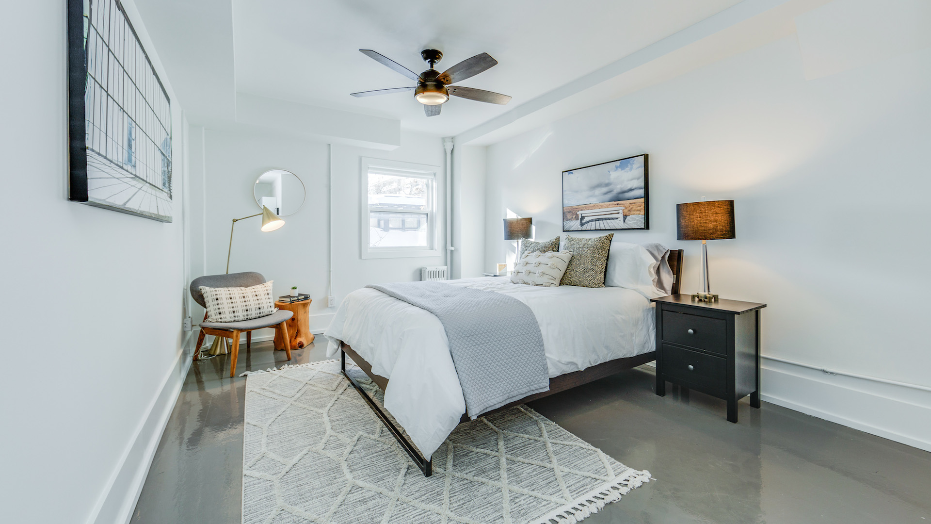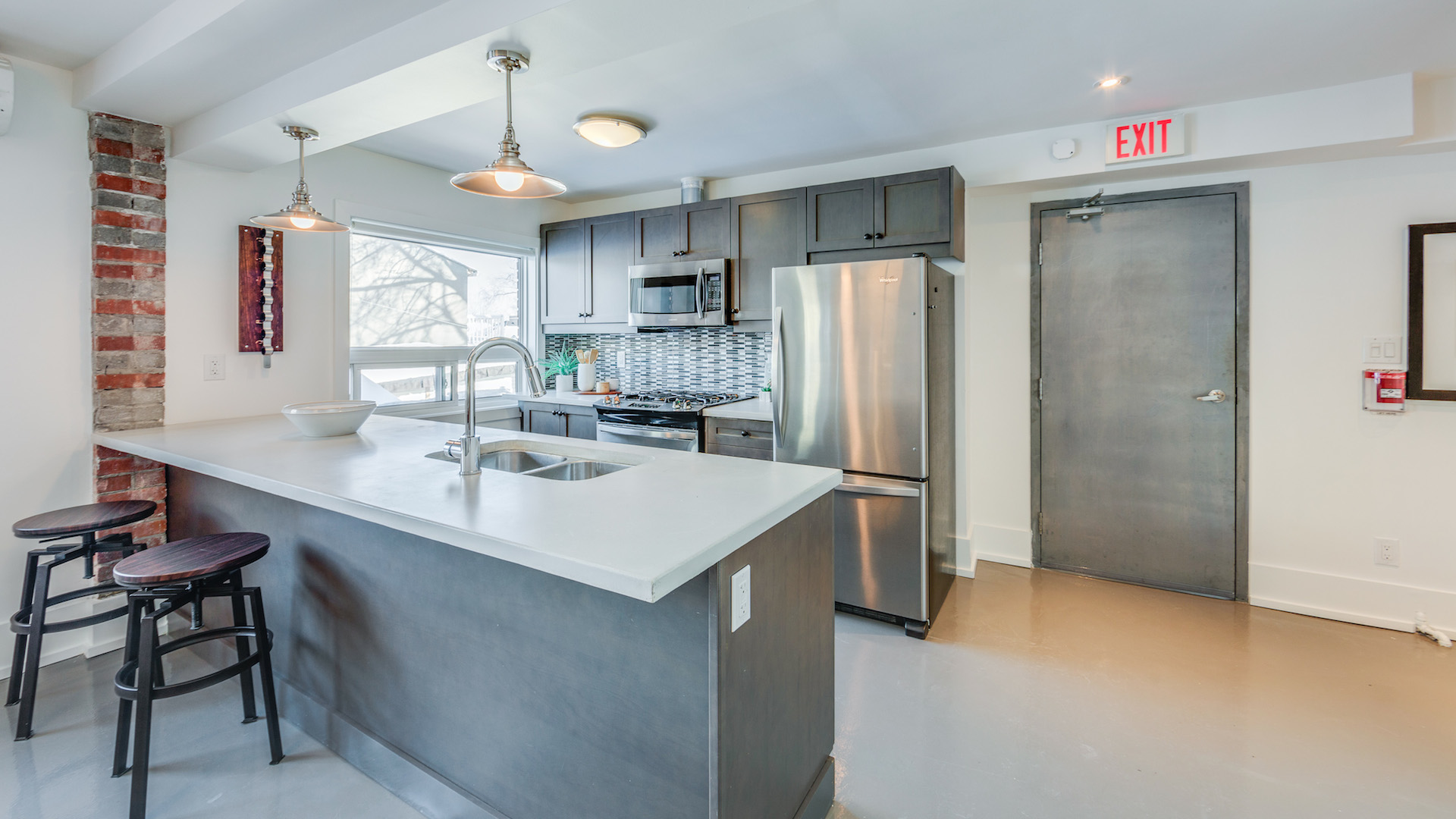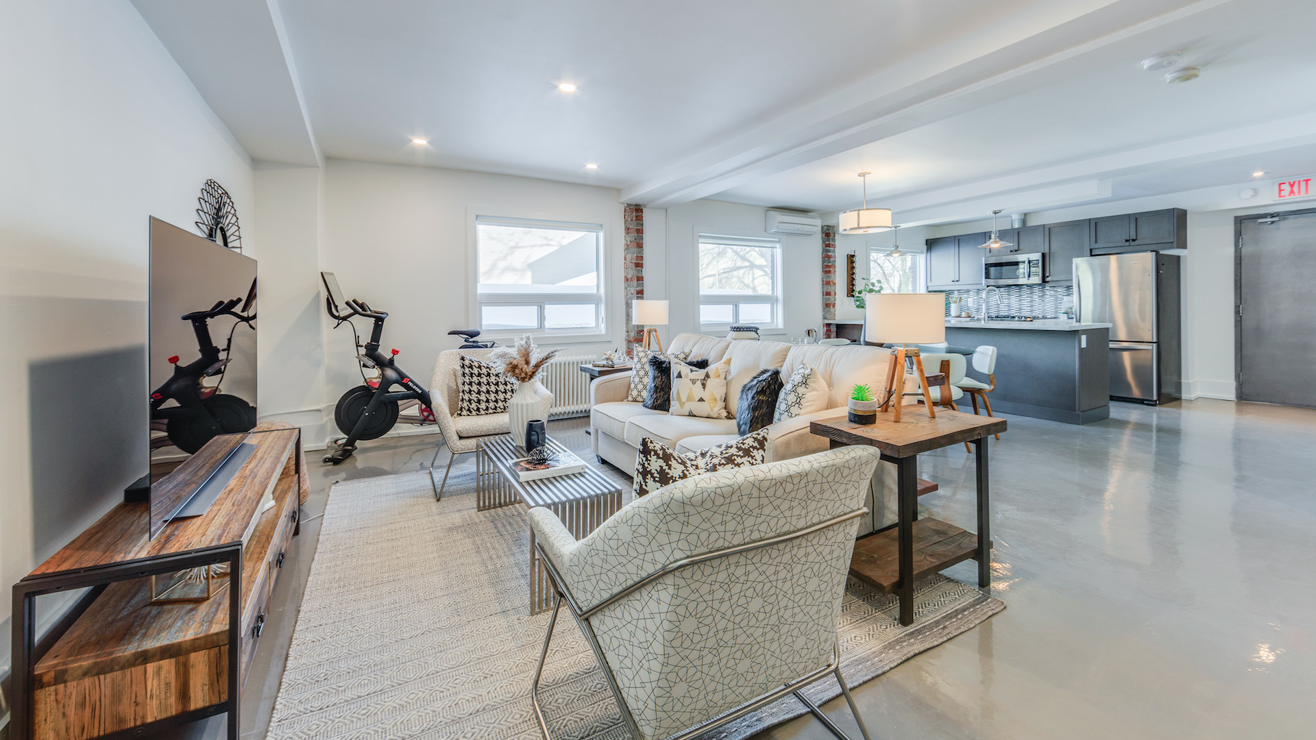 This unit has polished concrete floors and an open concept floor plan, making it feel super airy.