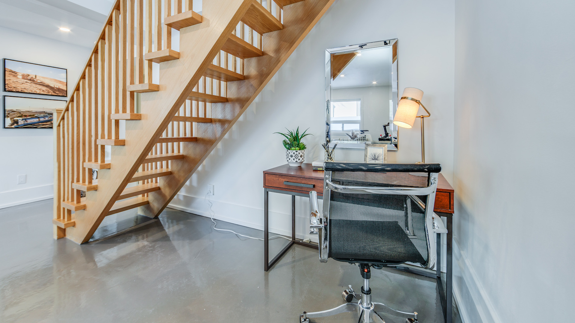 There’s a nook under the floating staircase, the perfect spot for a home office.