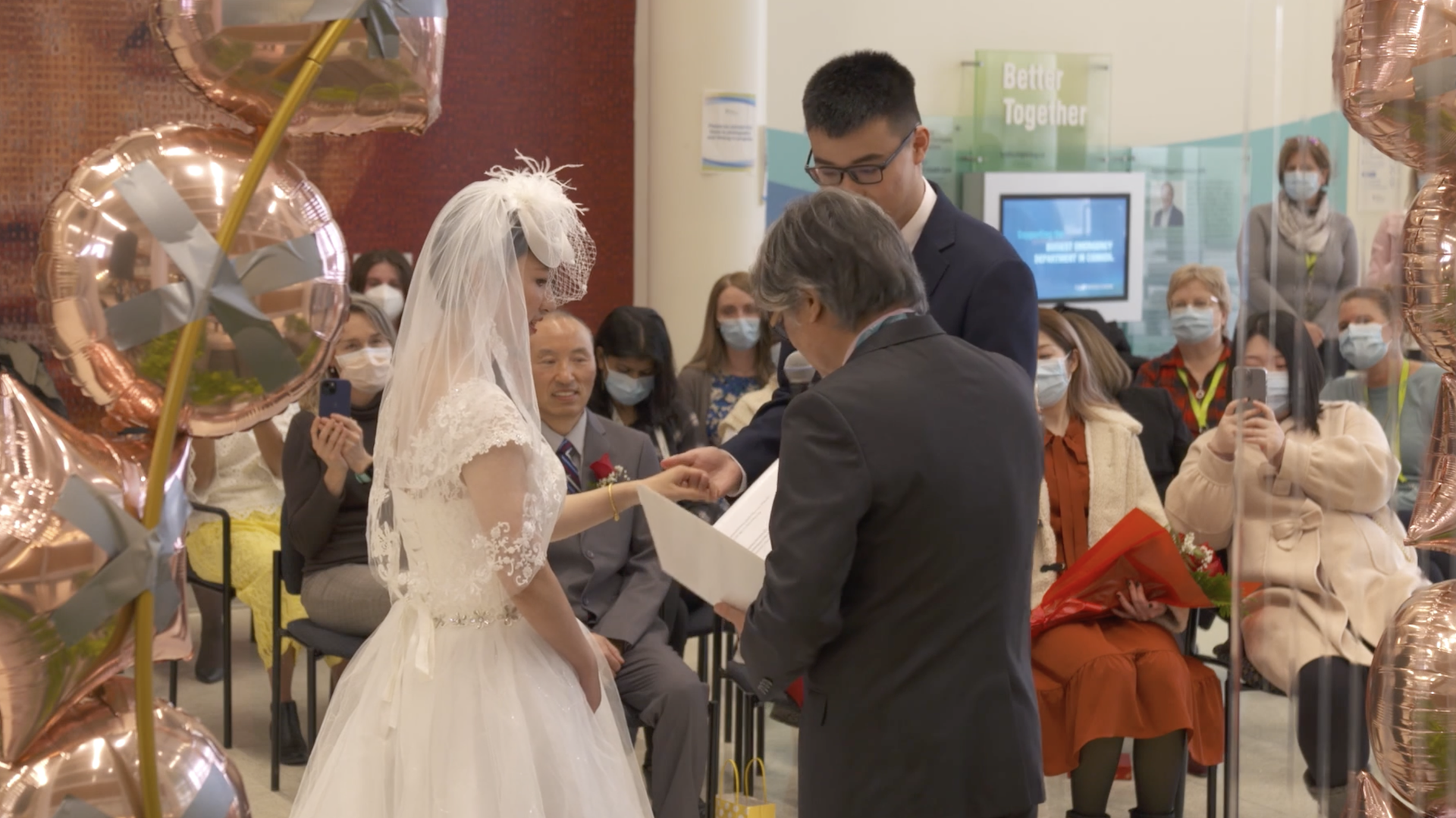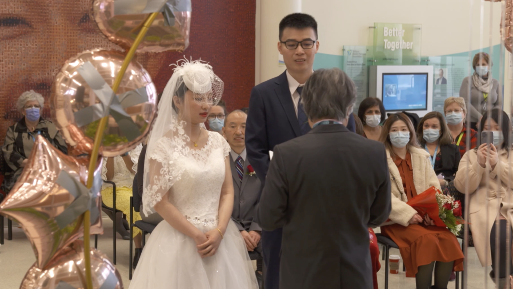 With both of their parents visiting from China for a short time, Yang and Gao wanted to get married before they left, and when the opportunity to have the wedding at the Queensway Health Centre came up, they said yes. They “felt the hospital has been a part of their journey over the last year and were looking forward to celebrating with them, as they feel like family.”