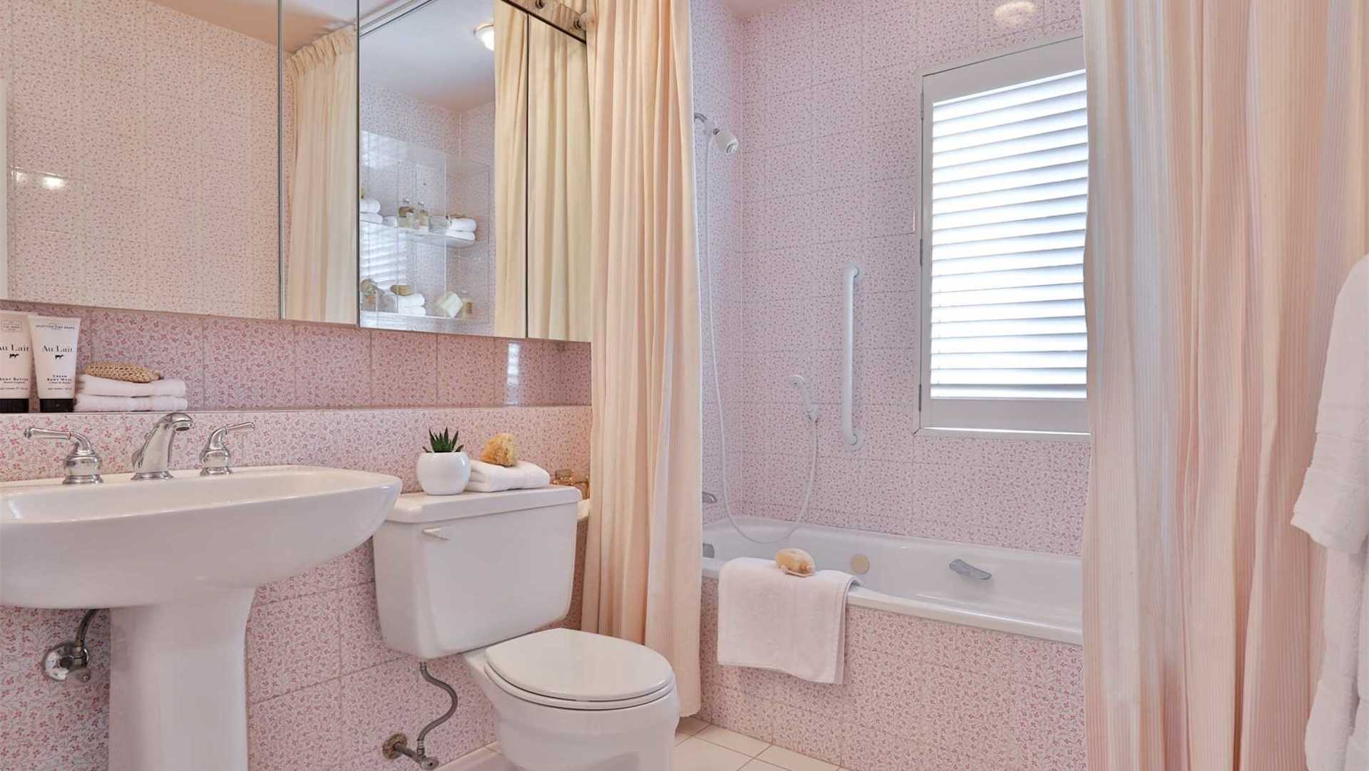 The primary bedroom includes a walk-out to a private balcony and a unique, pink-tiled four-piece bathroom. There’s also another living space on the second level with built-in shelves.