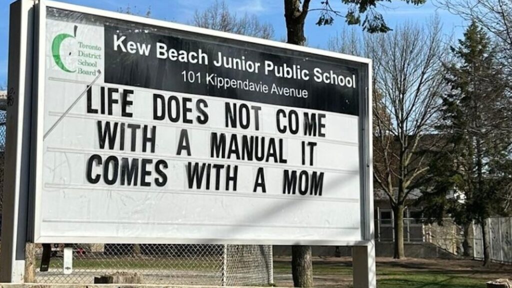 A sign at a Toronto public school in the Beaches neighbourhood has caused some outrage among parents after they saw the school’s Mother’s Day-themed message board. The message that caused the outrage read “Life does not come with a manual. It comes with a mom.”